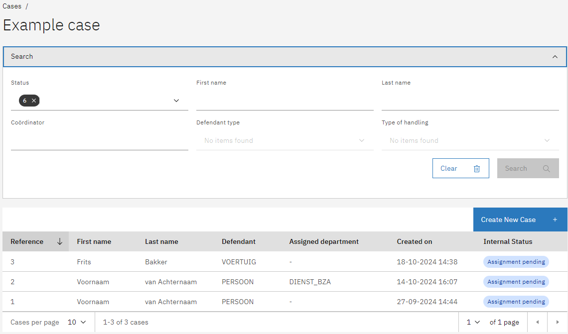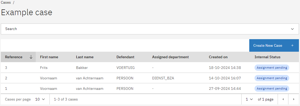 For each case a set of search fields can be configured. These fields will be displayed on top of the case list page within a search element. Search fields add the ability to filter cases that are displayed in the paginated list. Each search field adds the ability to filter on a specific field from the case data. This enables users to combine search fields to get the best result in the case list.