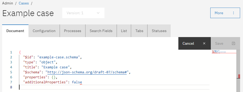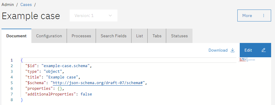The `properties` section is empty by default. This section contains the data structure for the case. The JSON schema validation has to be placed here.