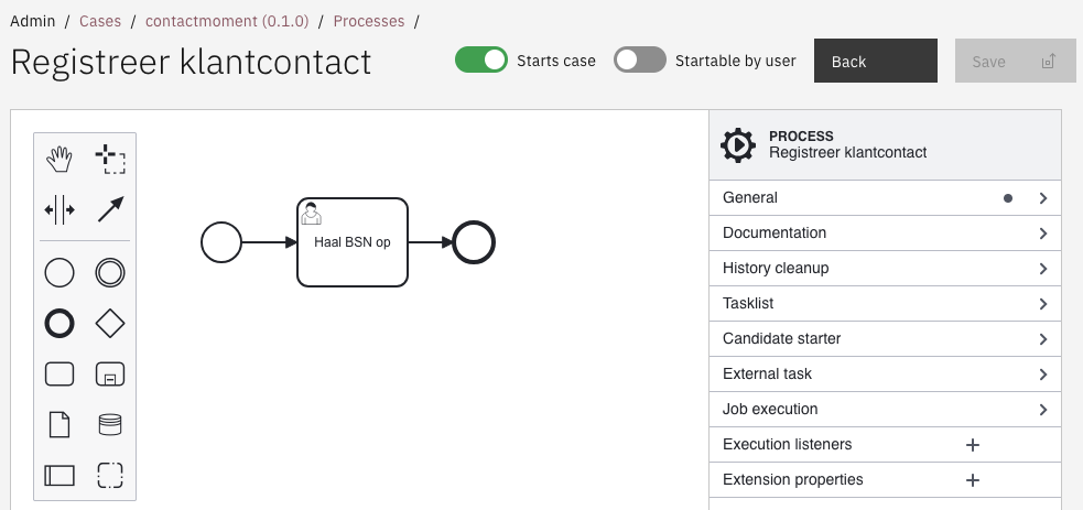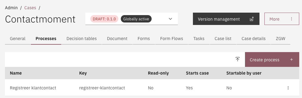 In order to be able to create new cases based on a case definition a process needs to be connected to the case definition. Valtimo uses processes (BPMN 2.0) to guide a case through an organization and gather case information needed for that specific case.