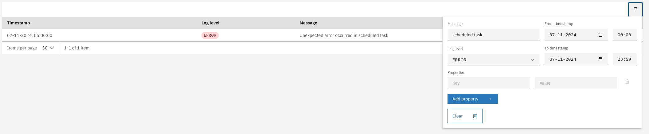 The list supports filtering the loglines, based on message, log level, timestamp and additional properties.