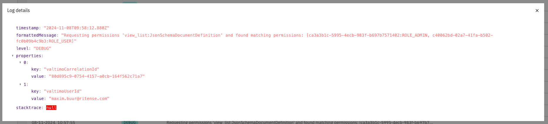 When clicking on one of the loglines, the details are shown. This includes the full message, additional properties, and a stacktrace when applicable.