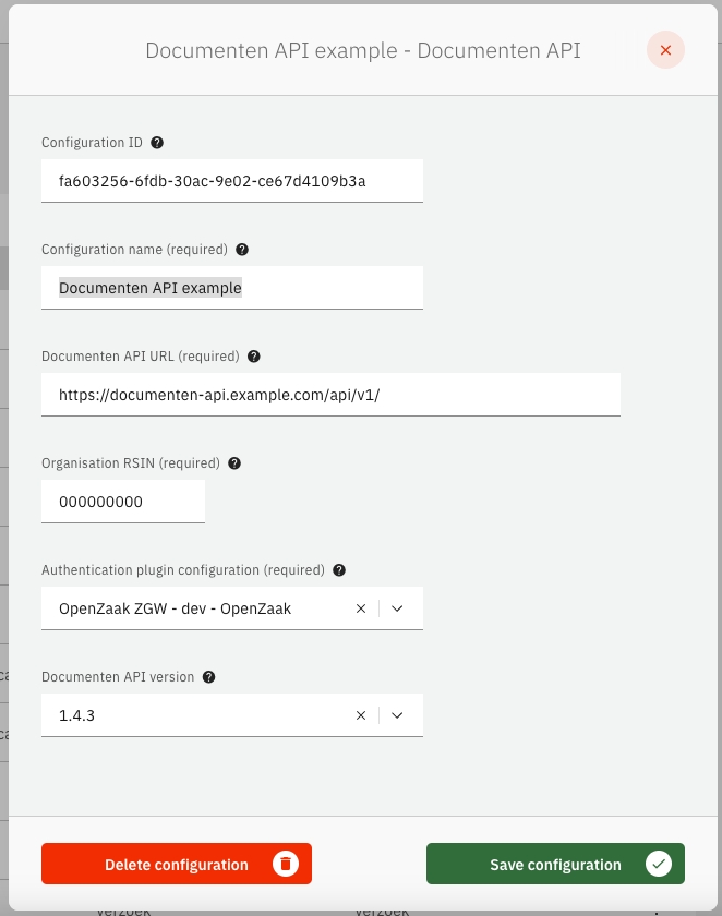 - Authentication plugin configuration ( - authenticationPluginConfiguration). Reference to another plugin configuration that will be used to add authentication to any request performed on the Documenten API. If no option is available in this field a plugin has to be configured that is able to authenticate for the specific application that hosts the Documenten API. (e.g. OpenZaak)