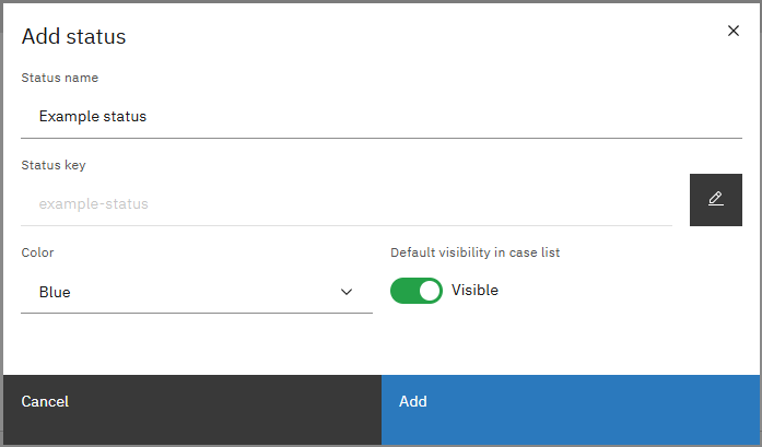 \&#xNAN;*The identifier of the status, this must be a unique value within the scope of the case it is added to. A key based on the name is generated automatically but can be overwritten via the pencil button.*