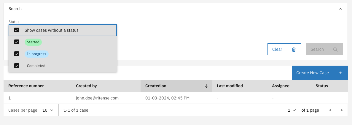 When statuses are configured for a case an additional search filter will be added to default search of the case list screen. This search filter enables to hide cases on the case list by default based on the status of the case.\