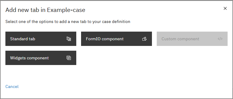 The **Add tab** button opens the *Add new tab in \<case>* modal, beginning with the configuration step to select the tab type. In this modal, **standard tabs** are available and next to this a **Form.io**, **Custom** or **Widget component** can be configured as a case tab.