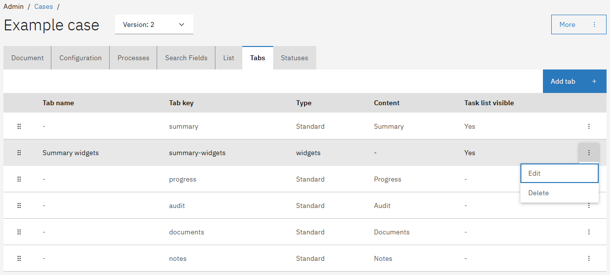 <table><thead><tr><th width="169.79296875" valign="top">Tab</th><th valign="top">Description</th></tr></thead><tbody><tr><td valign="top"><strong>Summary</strong></td><td valign="top">Displays case specific data from the case JSON document or external data sources. This page links to a specific Form.io form with the name <code>&#x3C;caseDefinitionKey>.summary</code></td></tr><tr><td valign="top"><strong>Progress</strong></td><td valign="top">Shows the current state of any active process and the history of all processes that have been executed while handling the case</td></tr><tr><td valign="top"><strong>Audit</strong></td><td valign="top">Shows a log of all performed case actions. Information on who did what and when was that action done is logged and displayed on this tab.</td></tr><tr><td valign="top"><strong>Documents</strong></td><td valign="top">Displays all files that where generated or uploaded while handling the case.</td></tr><tr><td valign="top"><strong>Notes</strong></td><td valign="top">Allows case handlers to leave case specific comments for internal use.</td></tr></tbody></table>