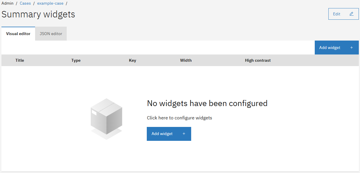 The widgets component makes it possible to configure a case tab with widgets that can be configured via the UI. Multiple widget types are available to present case data. When a widgets component is selected only the **Tab name**, **Key** and **task list visibility** can be configured for the tab.
