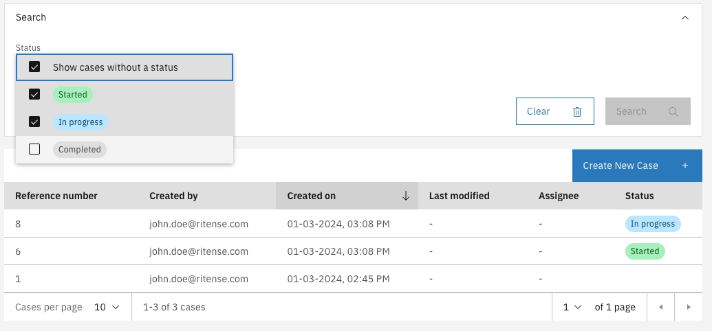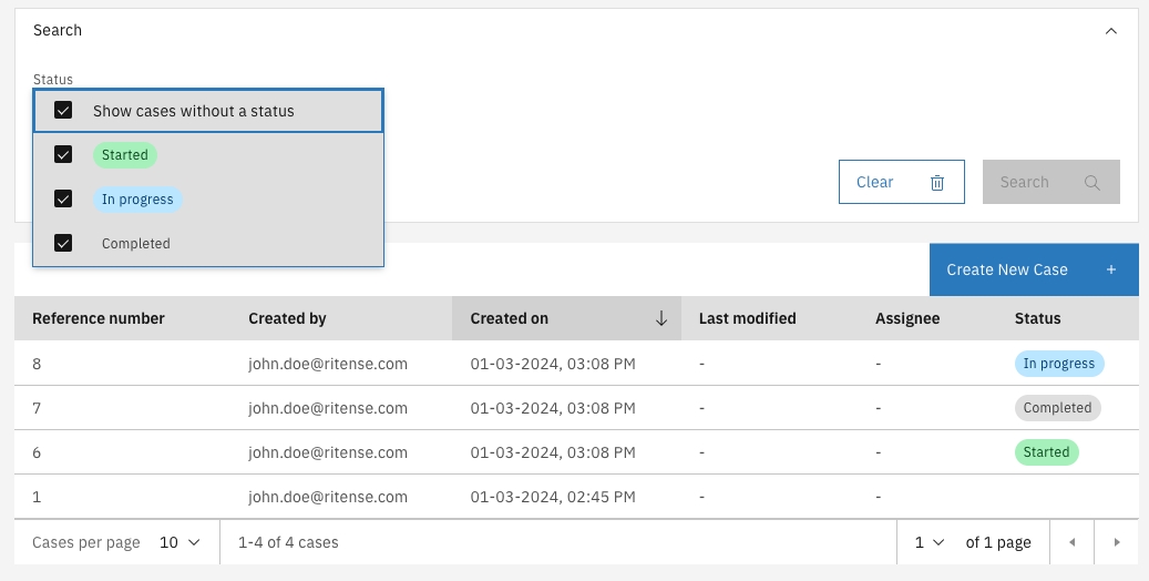 By adding the required status changes to the process the case list will represent a clear overview of the workload and the progress for that case. By using the Visible setting as described above cases in a certain status can easily be hidden be default. These cases can be made visible via the search UI. Below screenshot shows a case where the Completed status is configured not to be visible by default. This is what the search dropdown looks like when this is set. By enabling Completed the cases are immediately visible. A reload of the case list will fall back to the configured settings and the cases will be hidden again.