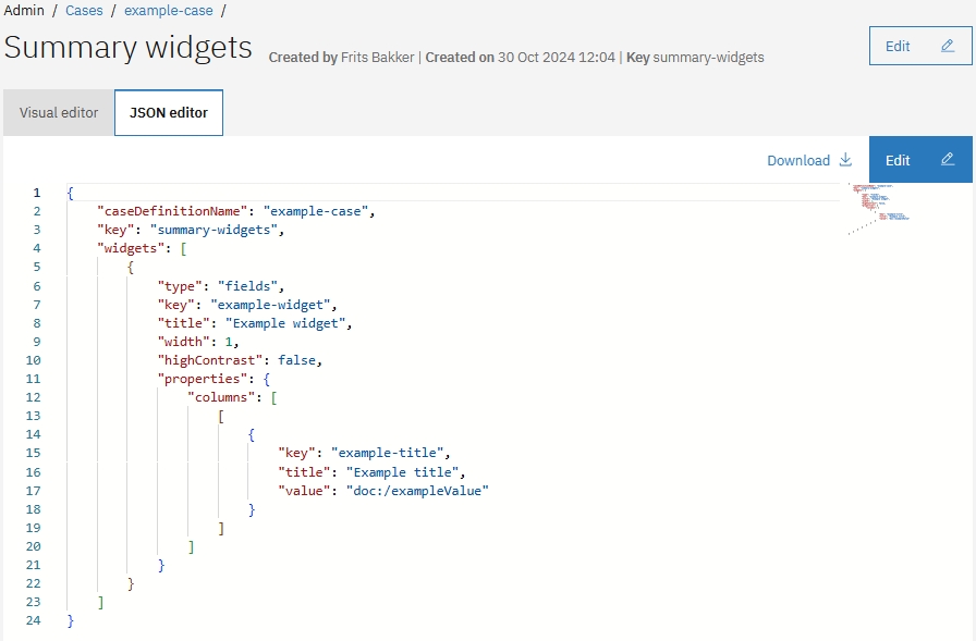 Widgets for a case can also be configured directly through a JSON editor. For process engineers, configuring widgets in JSON may offer greater control and efficiency. In the second tab of the Widget configuration UI, a JSON editor displays the complete widget configuration in JSON format. This editor includes error-checking functionality to ensure the JSON structure is correct.