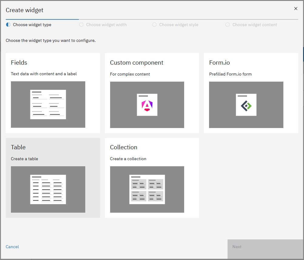 Click Add widget to open the create new widget modal that will guide the widget creation in 4 steps.