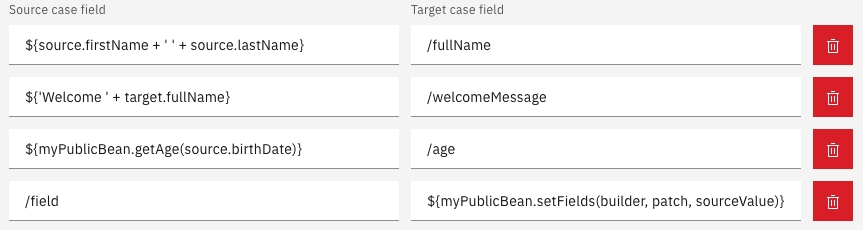 When the new case definition contains a completely new property, this new field can be given a default value by entering this value in the source field. The case migrator will always try to case the value from the source field to the type that is needed for the target field.