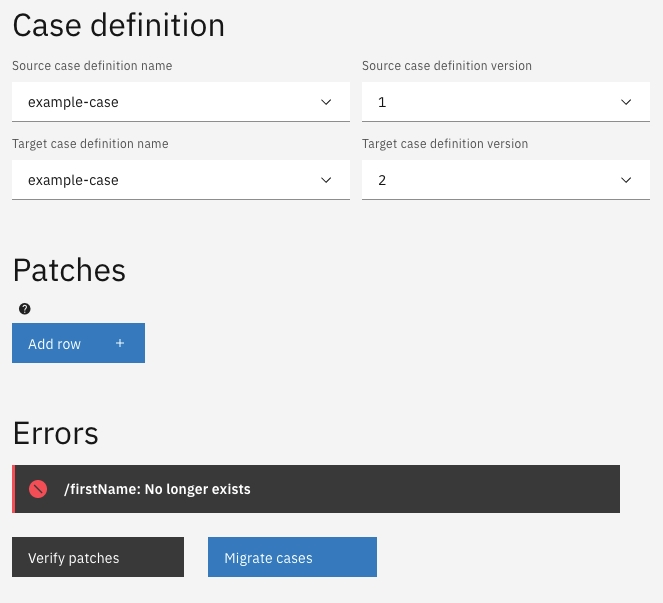 When clicking the verify button, the tool will check if there are any possible issues if we were to migrate the cases. In our example we will get the error shown in the image below. Verification is limited. The verify button has detected an error, but has not detected all potential problems. It has detected the new schema no longer has the property /firstName