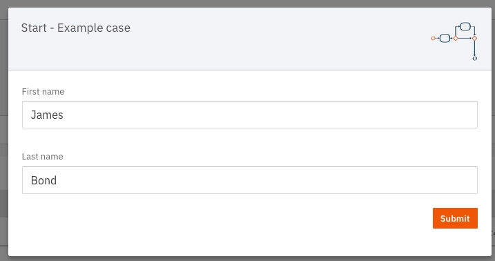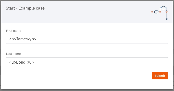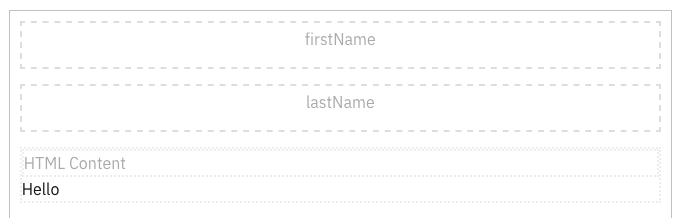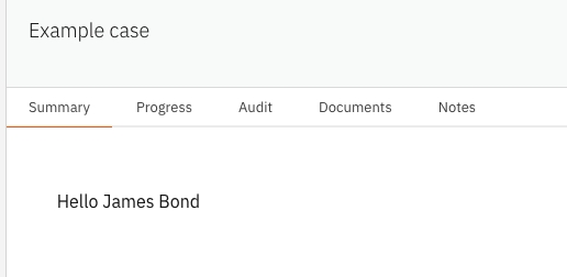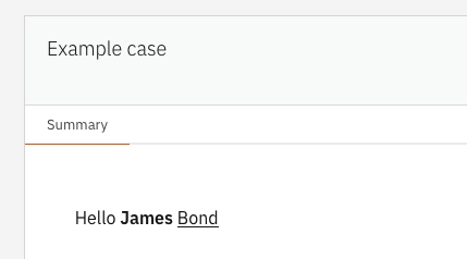 By adding expressions to any text field in the form configuration, it is possible to use variables in that text. The example below shows how the name stored in the case document can be used in a HTML field in a form. This is used to display the name as part of a message.