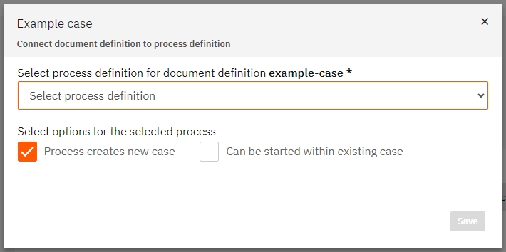 In order to be able to create new cases based on a case definition a process needs to be connected to the case definition. Valtimo uses processes (BPMN 2.0) to guide a case through an organization and gather case information needed for that specific case.
