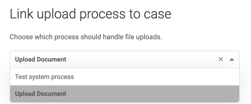 When a document is uploaded to a case, the 'upload process' connected to the case definition will be started to handle the upload. The upload process needs to be configured on the case page: