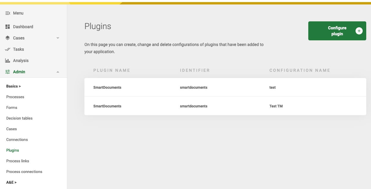 Plugins can be configured in the plugin menu in Valtimo. The plugin menu is found under the admin menu. Admin privileges are required to configure plugins.