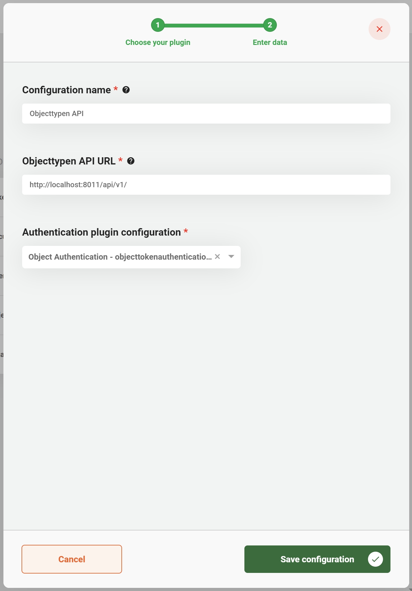 .Authentication plugin configuration. Reference to another plugin configuration that will be used to add authentication to any request performed on the Objecttypen API. If no option is available in this field a plugin has to be configured that is able to authenticate for the specific application that hosts the Objecttypen API. (e.g. Object Token Authentication)