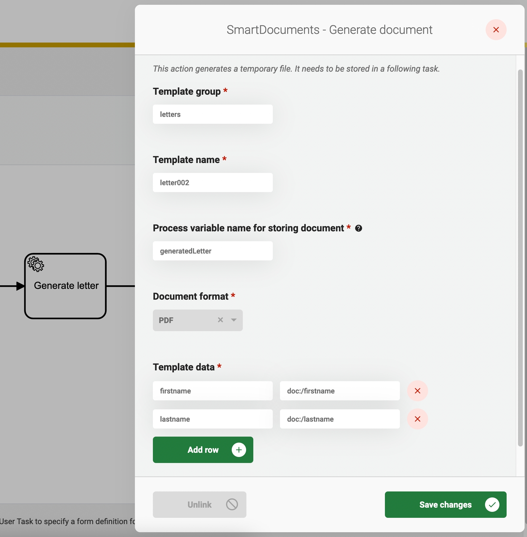 After filling in all fields, the process-link can be saved. From now on, every time the service task is executed, a document is generated. Remember that the generated document is not visible anywhere yet. A logical next step is to handle the generated document. For example, the next service task can add the generated document to the case.