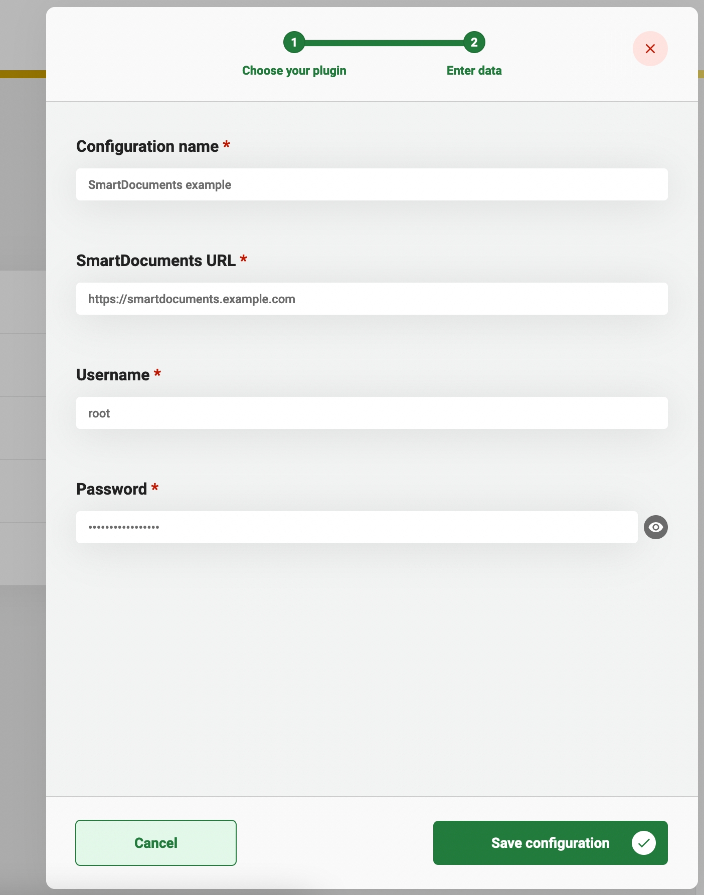 A document is generated with data taken from the 'Template data'. The value on the left-hand side must match the placeholder in the SmartDocuments template. The value on the right-hand side can contain any of the following values: