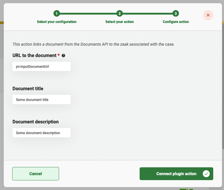 The Link uploaded document to zaak action takes a document stored in a Documenten API and links it to a zaak. The zaak to which the document is linked is based on the process for which the action is performed. The process belongs to a case that should already have a zaak instance link before this action is performed. The link between a zaak and a document is stored as a 'zaakinformatieobject' in the Zaken API. After this plugin action has been selected, the user does not have to input any configuration data.
