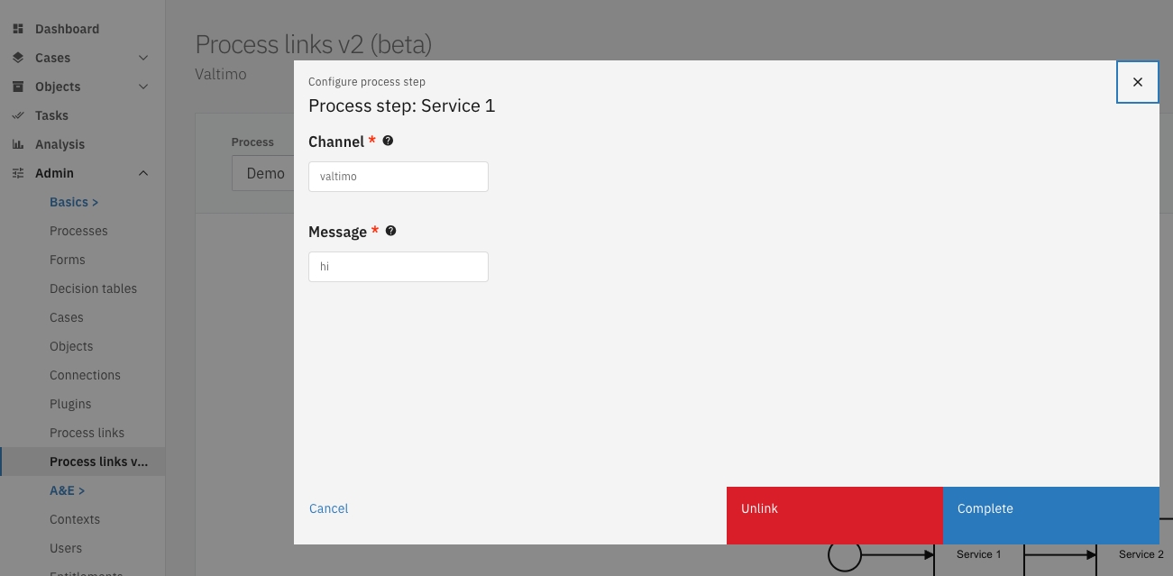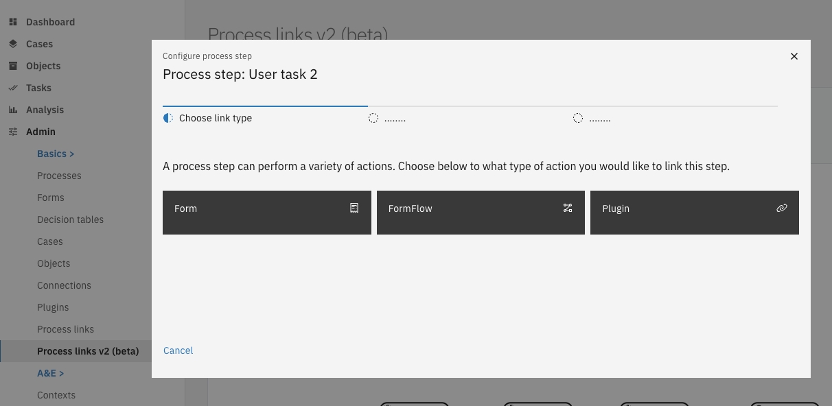 Note: It is not possible to change the type of existing process links (form, form-flow or plugin), nor is it possible to change the selected plugin configuration. To do that, please unlink the current process link and create a new one.