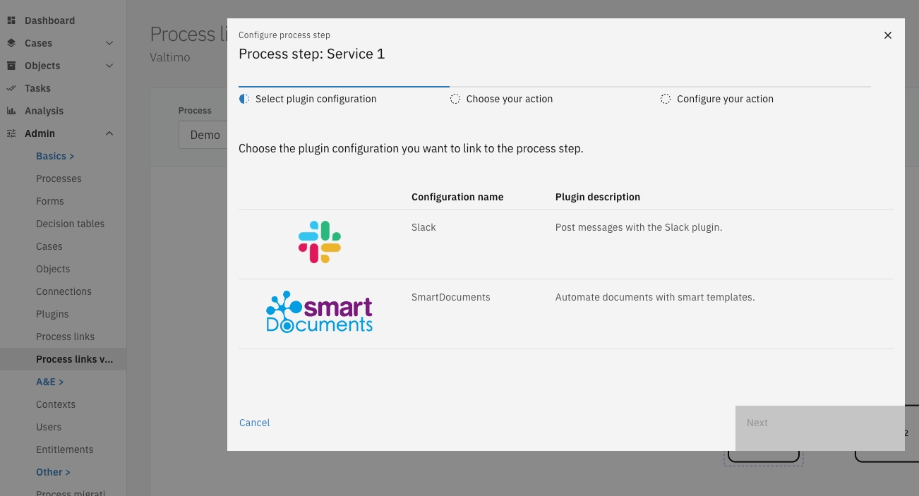 When configuring a plugin process link, a wizard is presented to choose between the available plugin configuration, actions and (optionally) additional settings for that action.